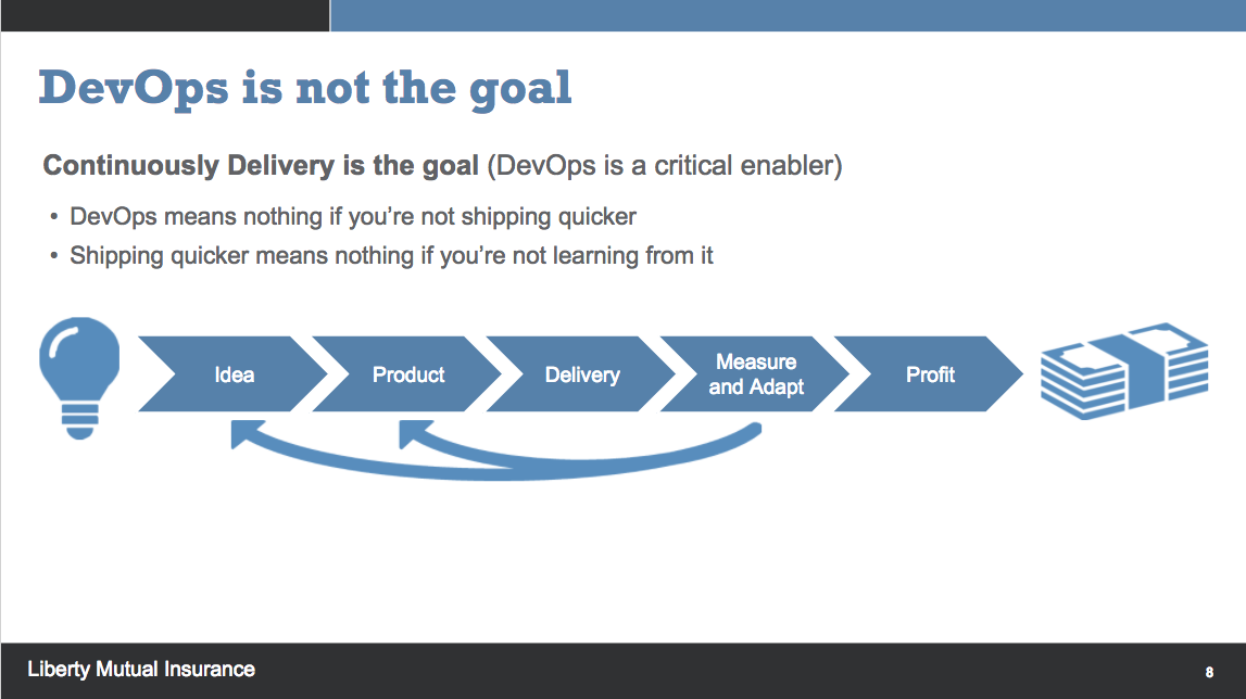 This talk looked at Liberty Mutual’s transformation to Continuous Integration, Continuous Delivery, and DevOps. For a large, heavily regulated industry, this task can not only be daunting, but viewed by many as impossible. Often, organizations try to reduce the friction through micro-fixes, but Eddie’s team asked how to change the culture to reduce the friction and concluded with the following final points:
