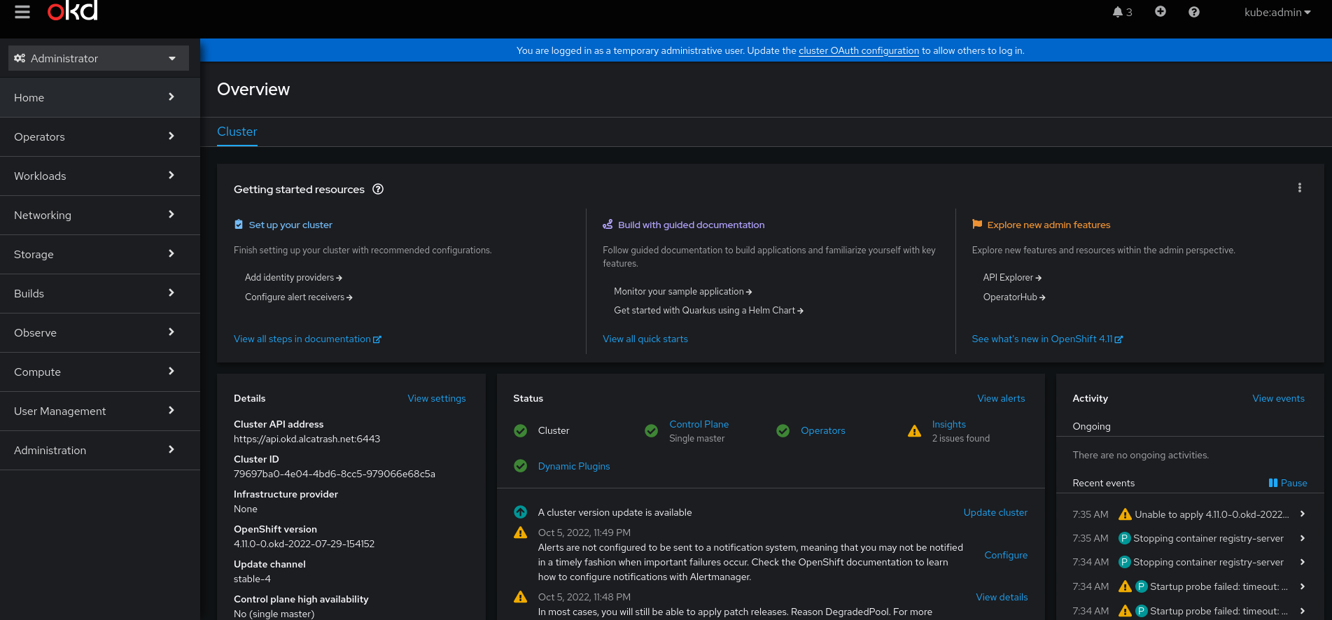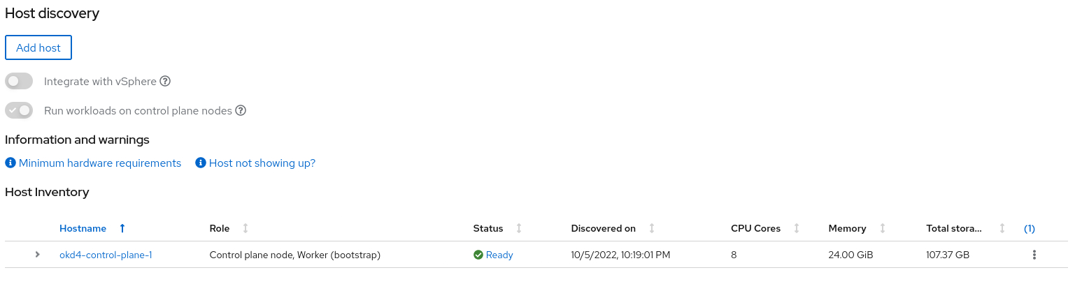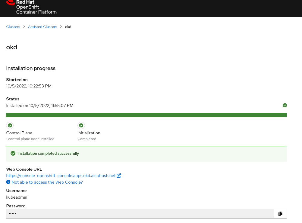 And there it is, your own single node OpenShift / OKD cluster. You can do everything with it, except one thing: upgrading to a new release. That is not possible.
