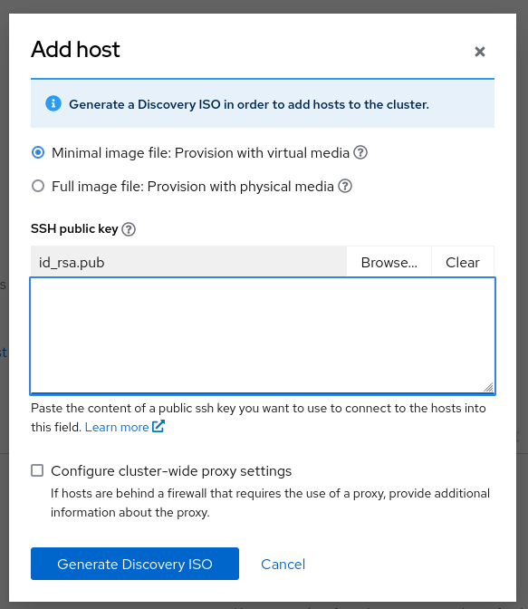 After clicking next, you will see the Host discovery screen. Click on the Add Host button. In this menu you can paste your SSH key. Insert your SSH key and choose the minimal image file. After that, you can click the Generate Discovery ISO Button. Now the magic will happen ;-).
