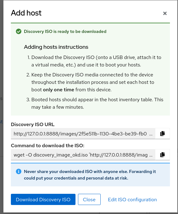 At this point, the assisted installer generated a iso that can be used for provisioning the Openshift node.