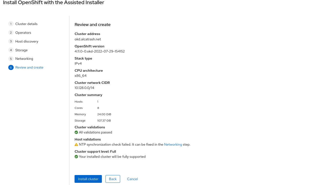 Now you will be shown a screen where you can setup the cluster. Make sure to enter the correct Cluster Name corresponding with your DNS zone. In my case my cluster name will be okd and my base domain will be alcatrash.net.